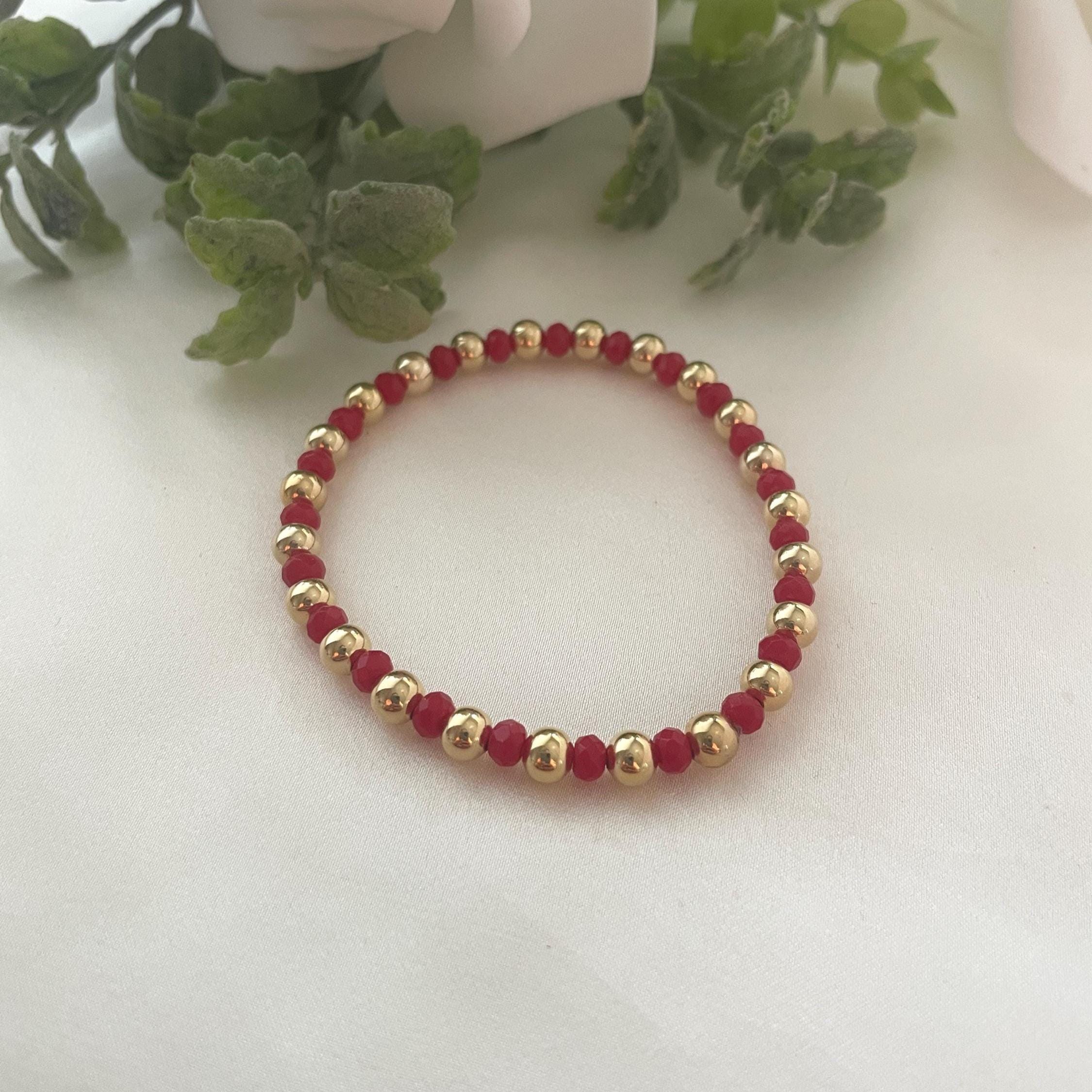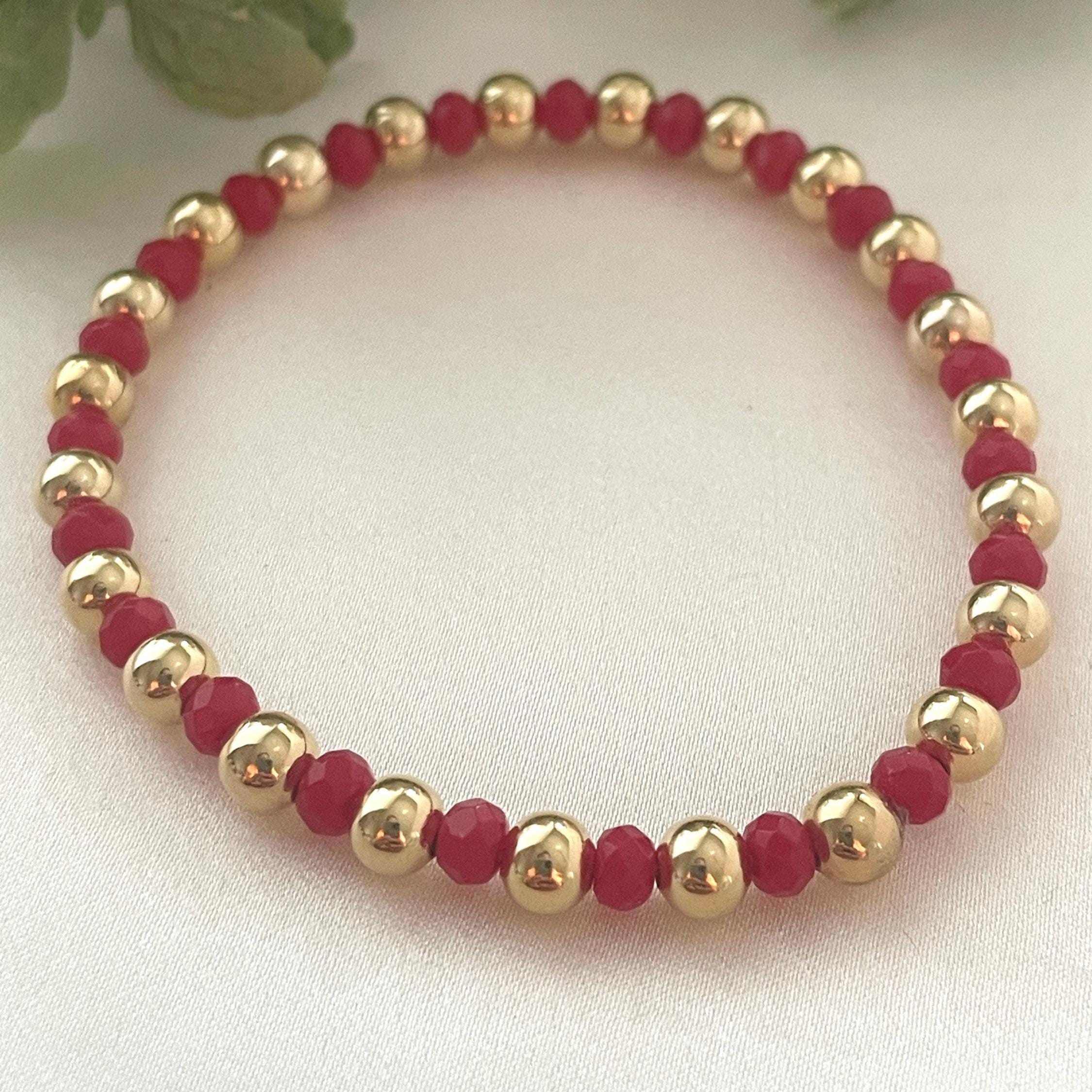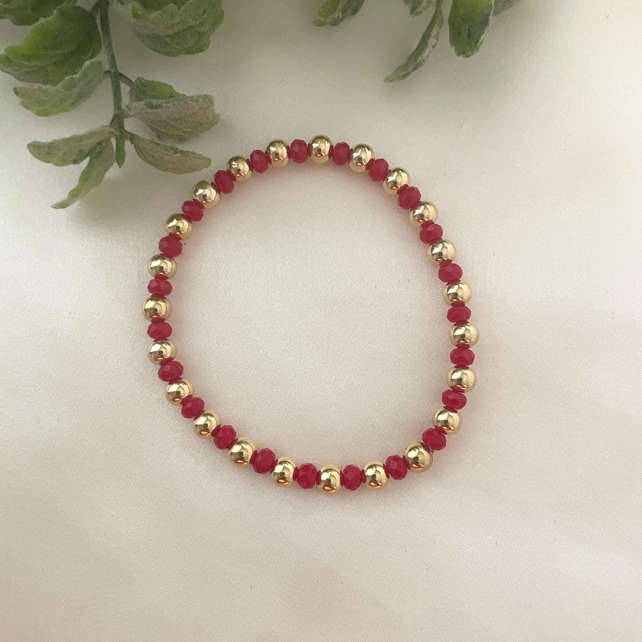 Red Agate Beaded Bracelet, Gold-Plated Ball, Stretchy Gemstone, Handmade