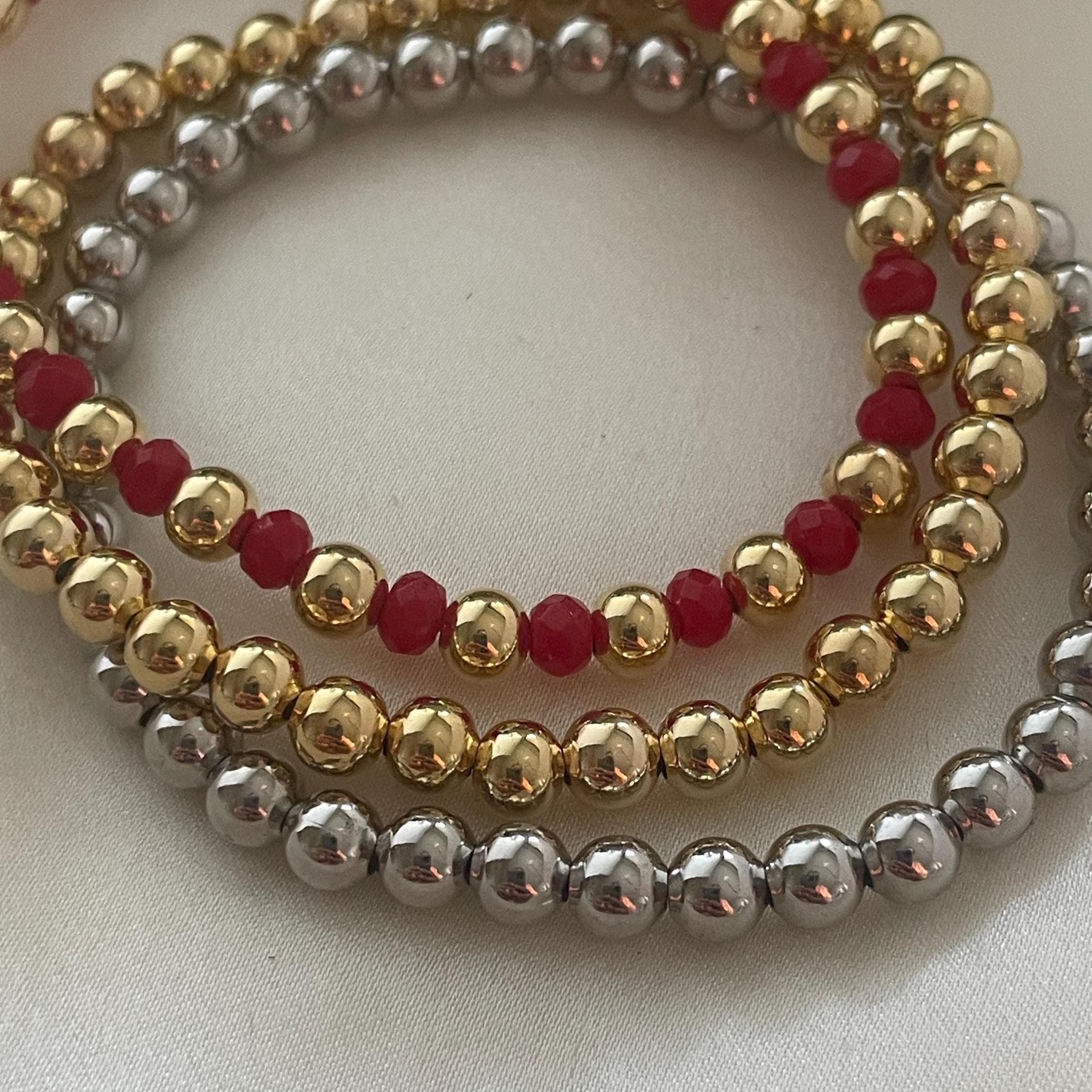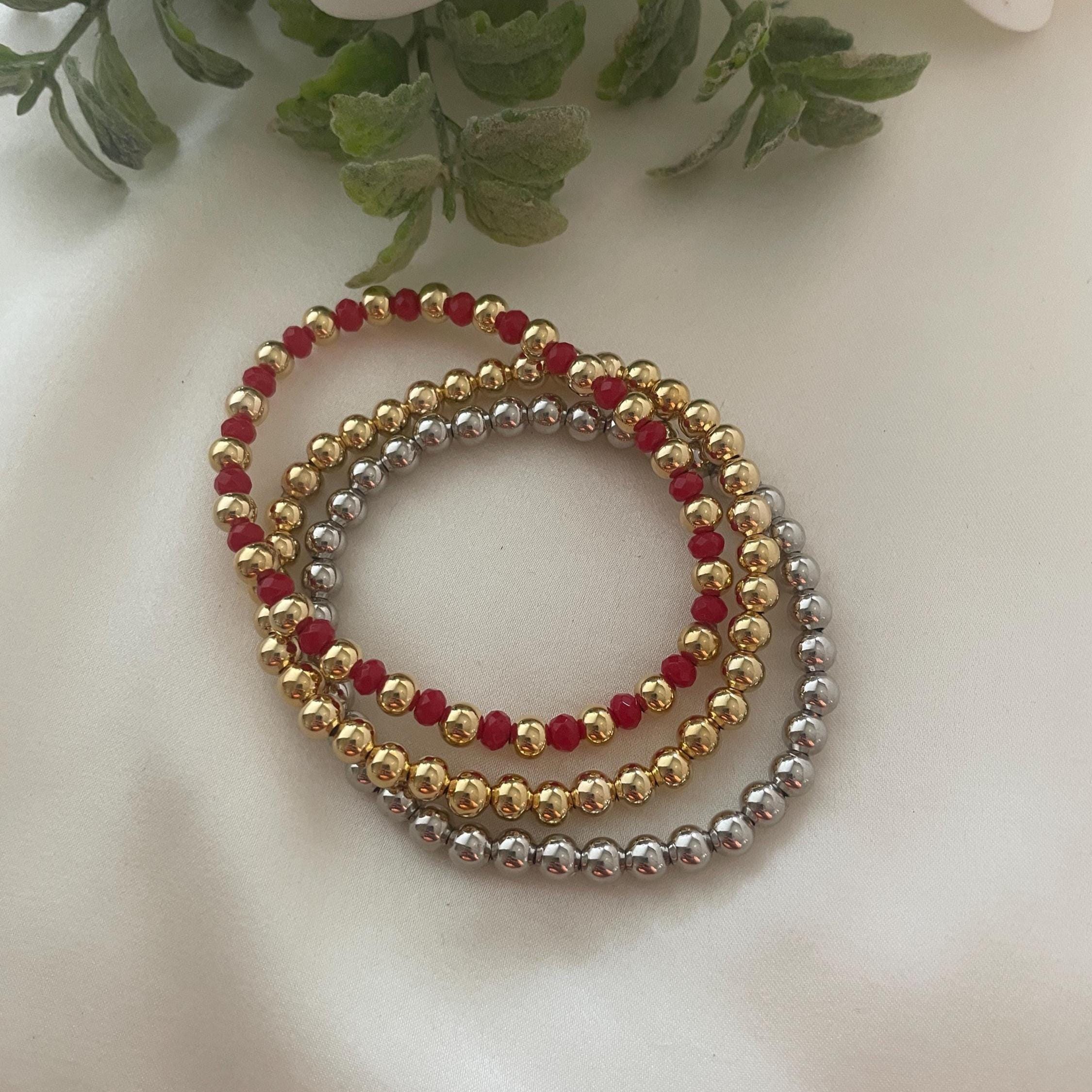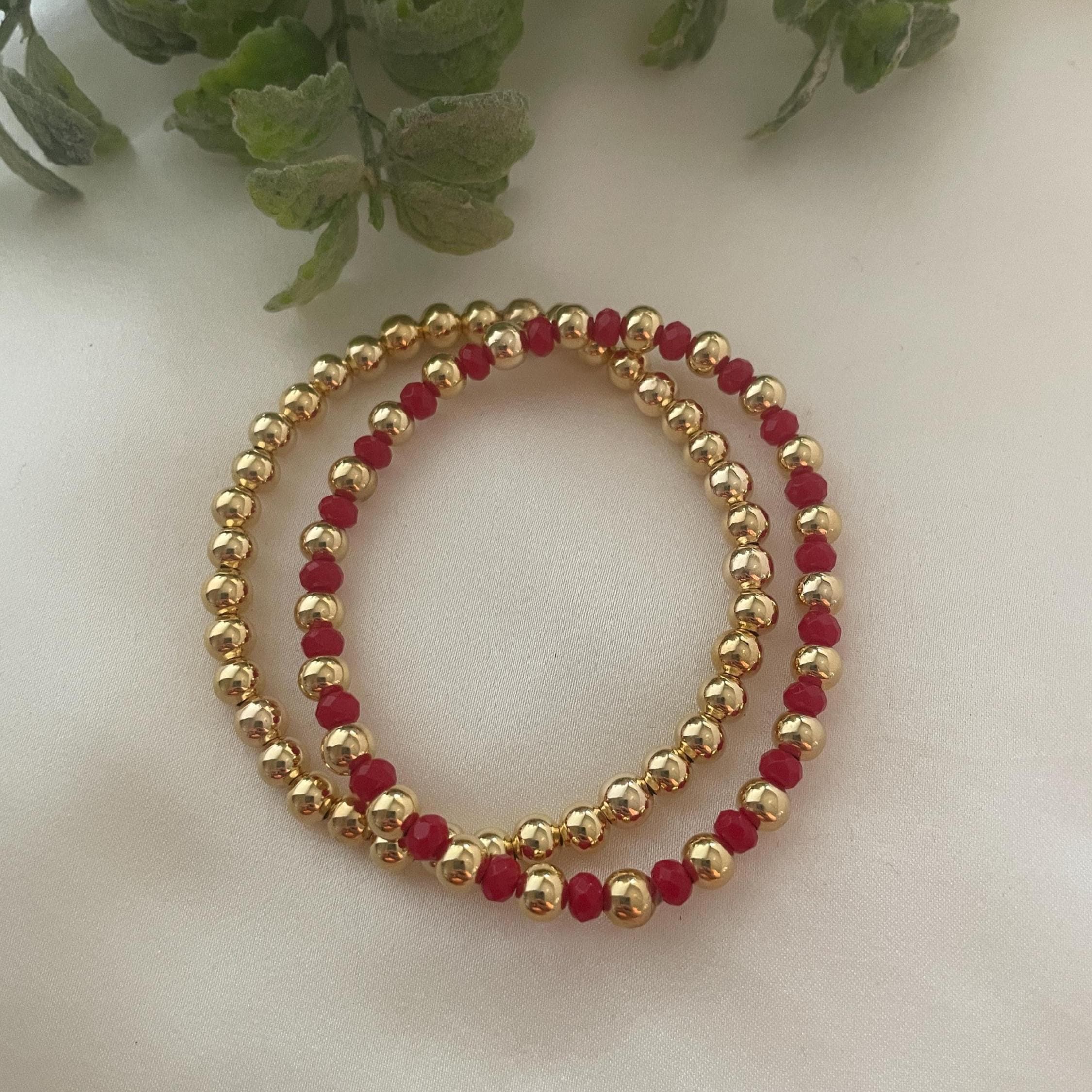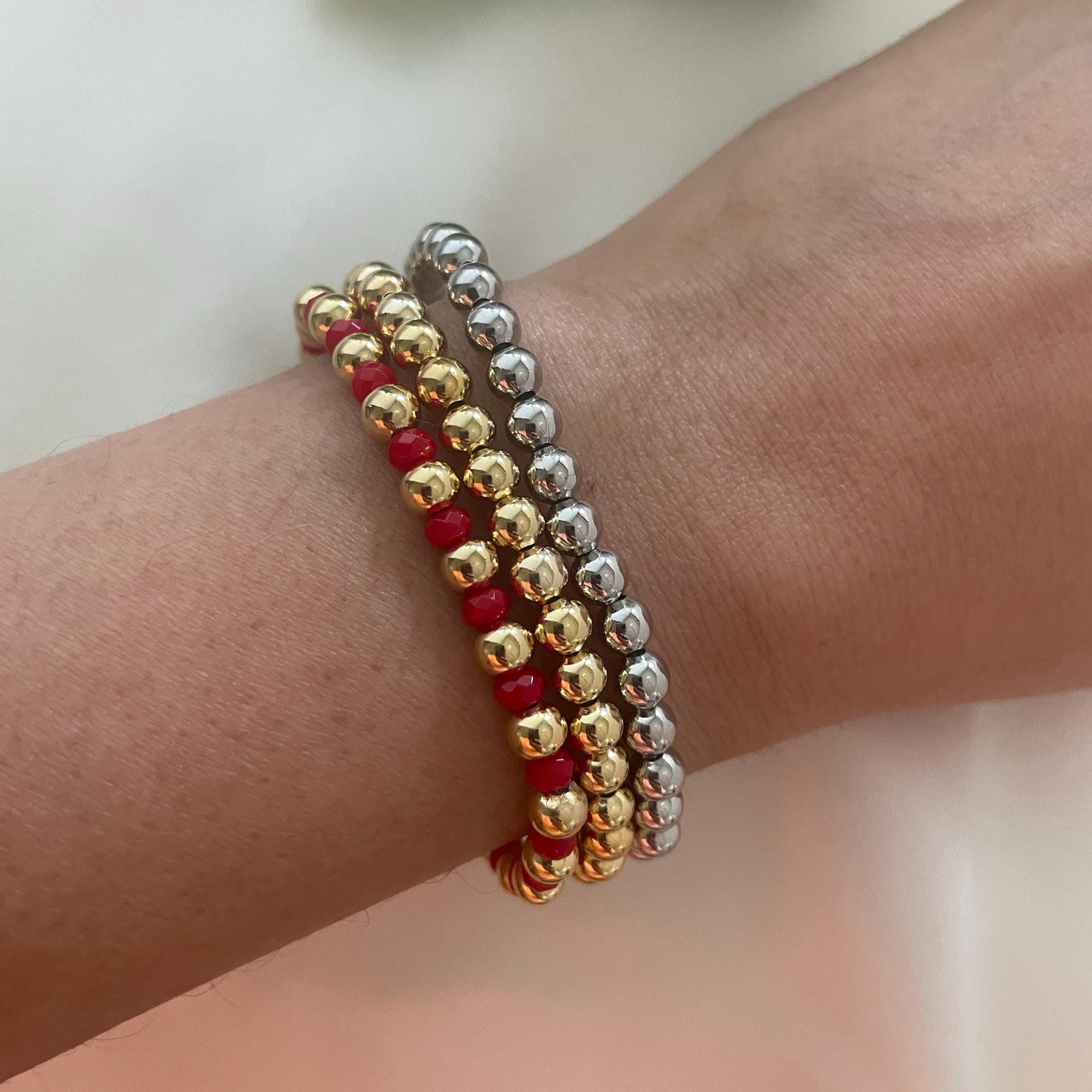 Red Agate Beaded Bracelet, Gold-Plated Ball, Stretchy Gemstone, Handmade