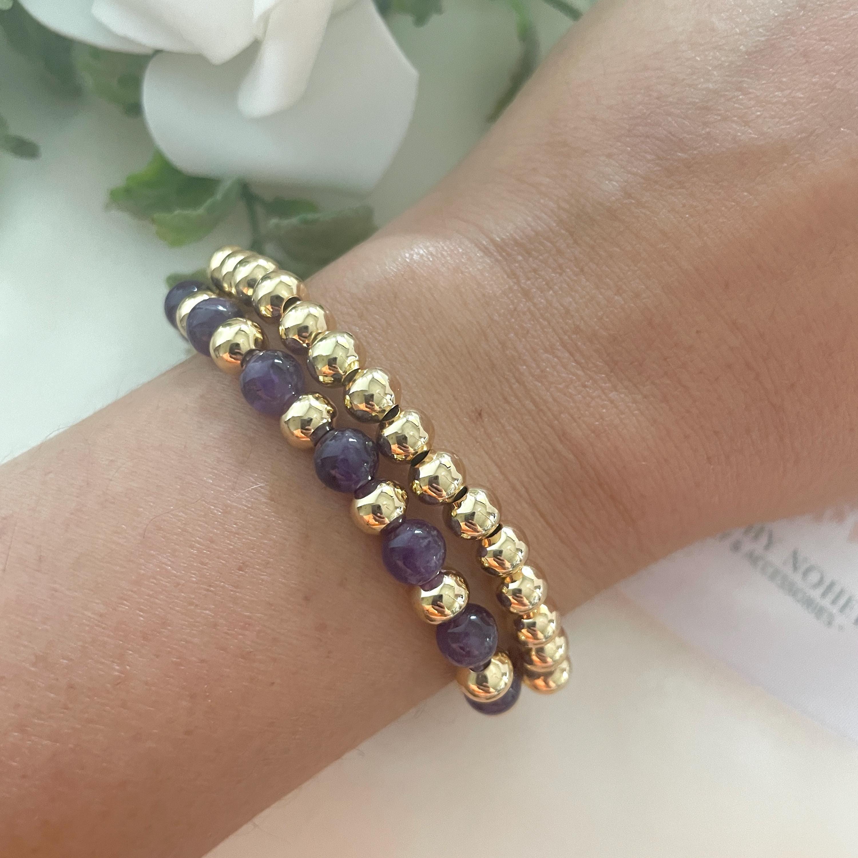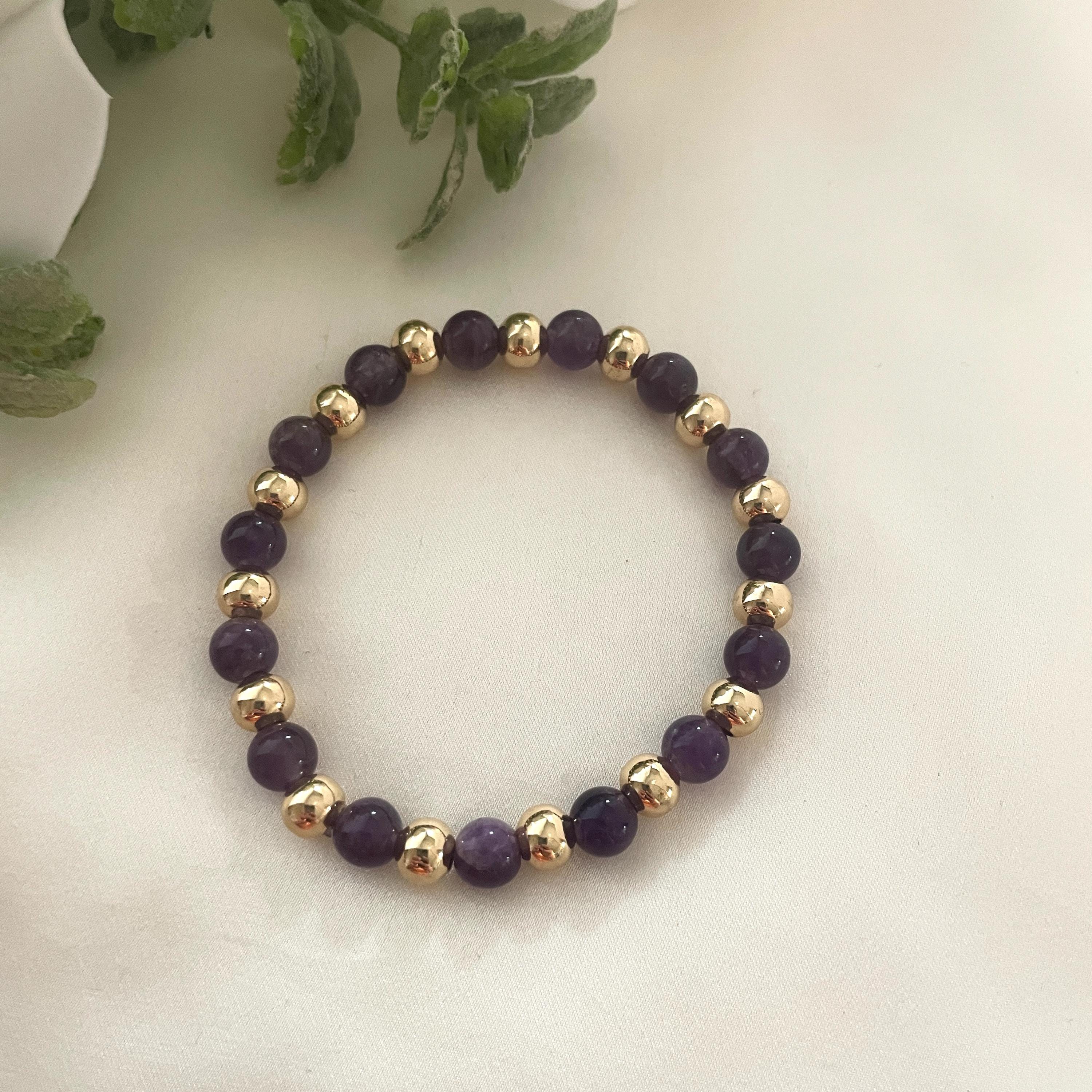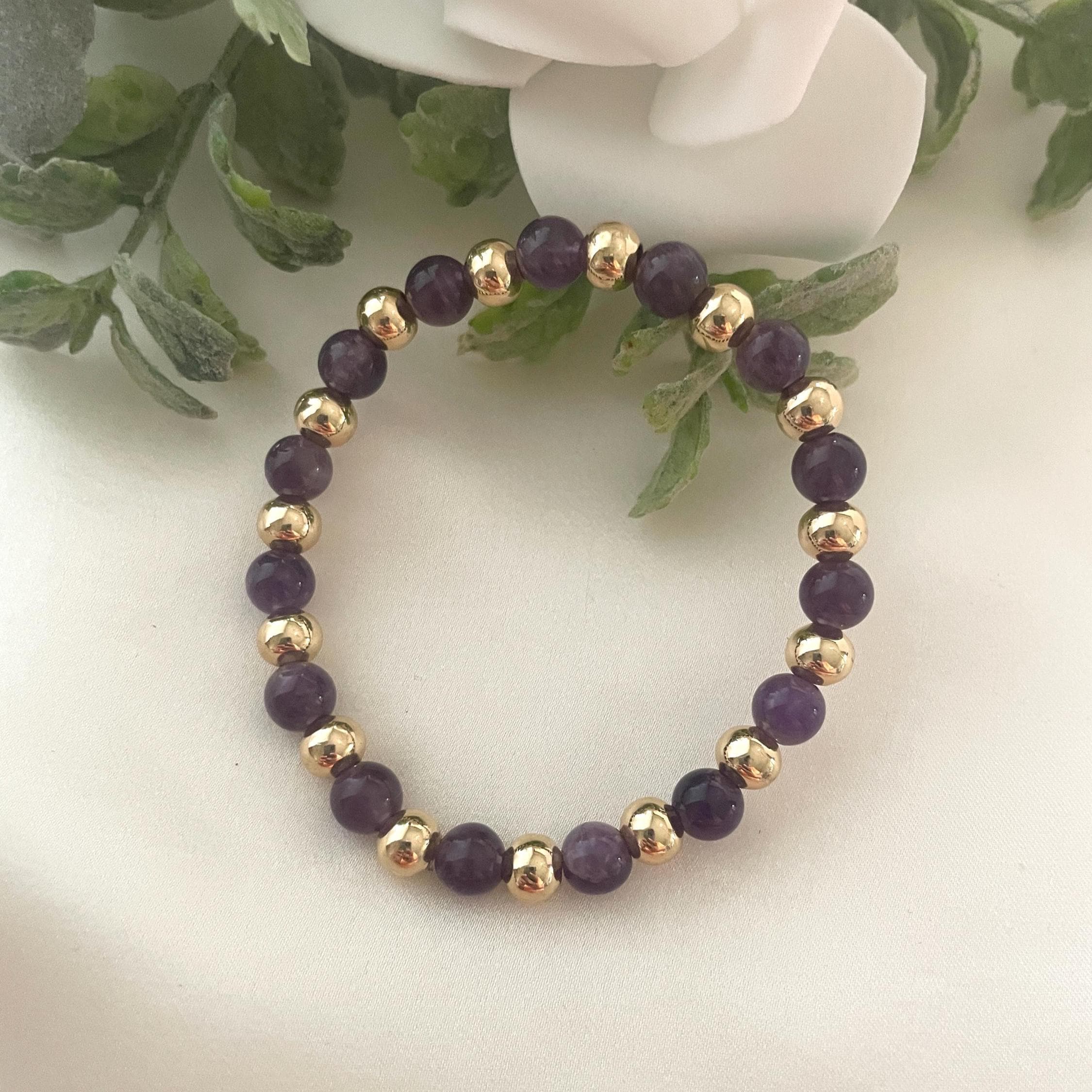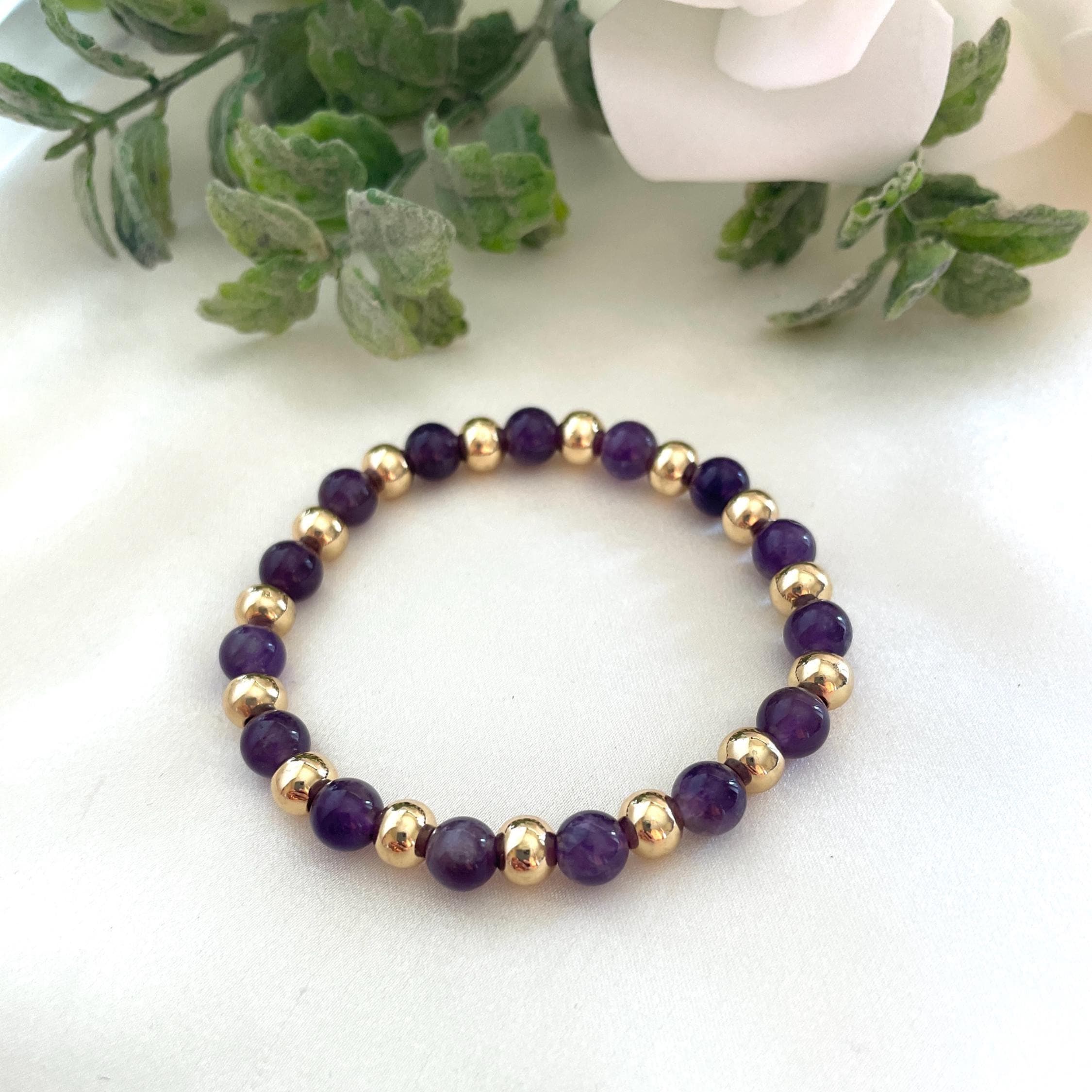 Amethyst Beaded Bracelet, Gold Accent, Handmade Stretchy Jewelry