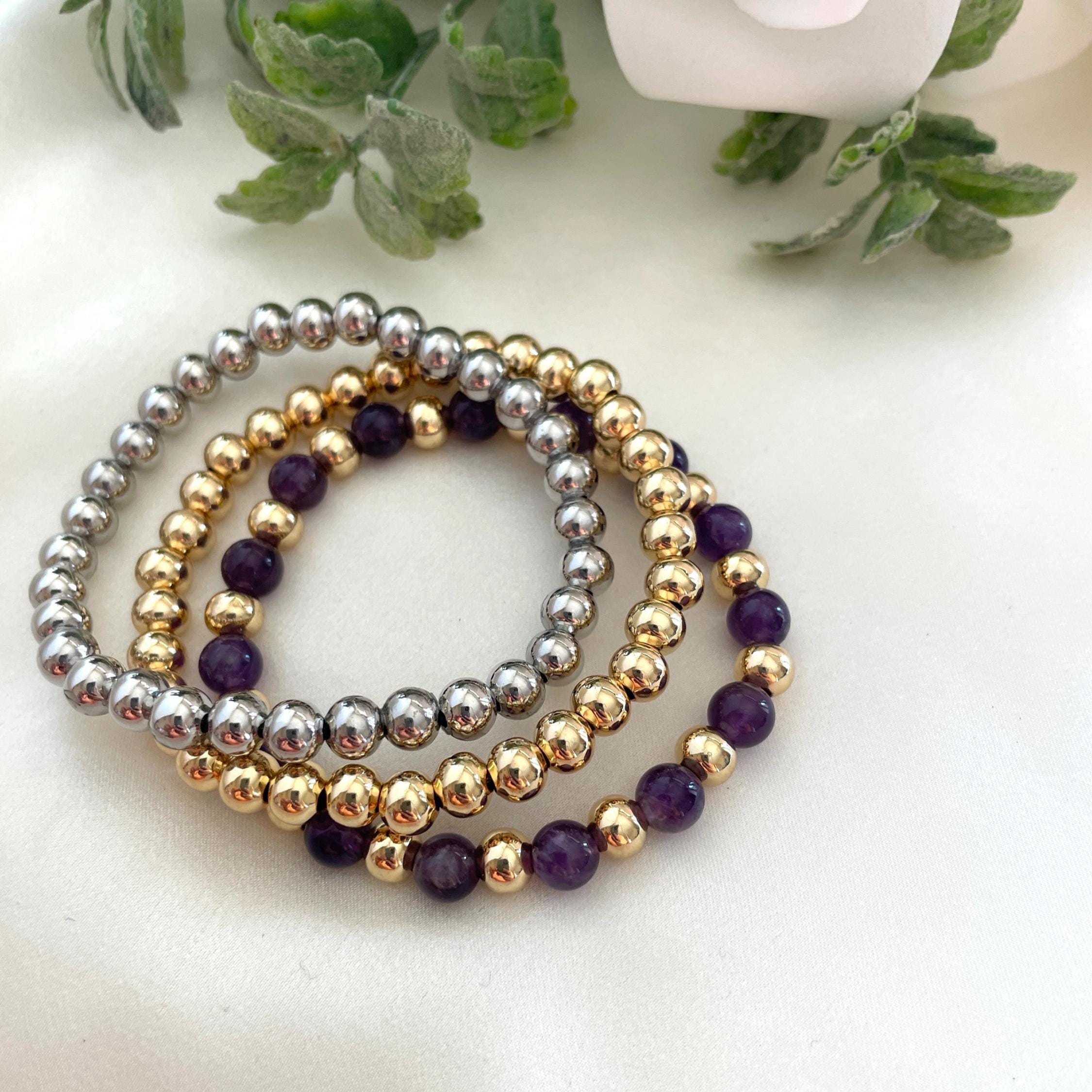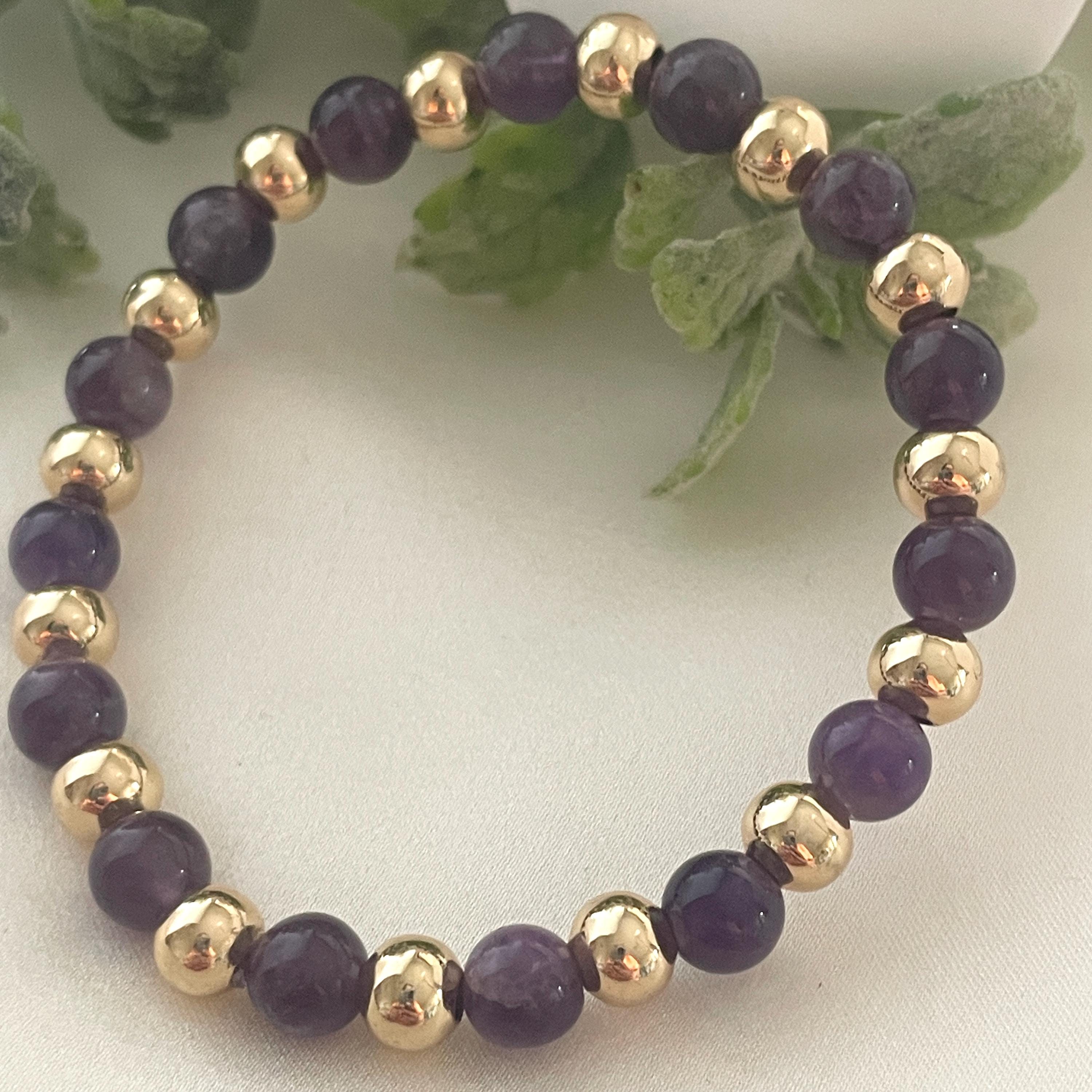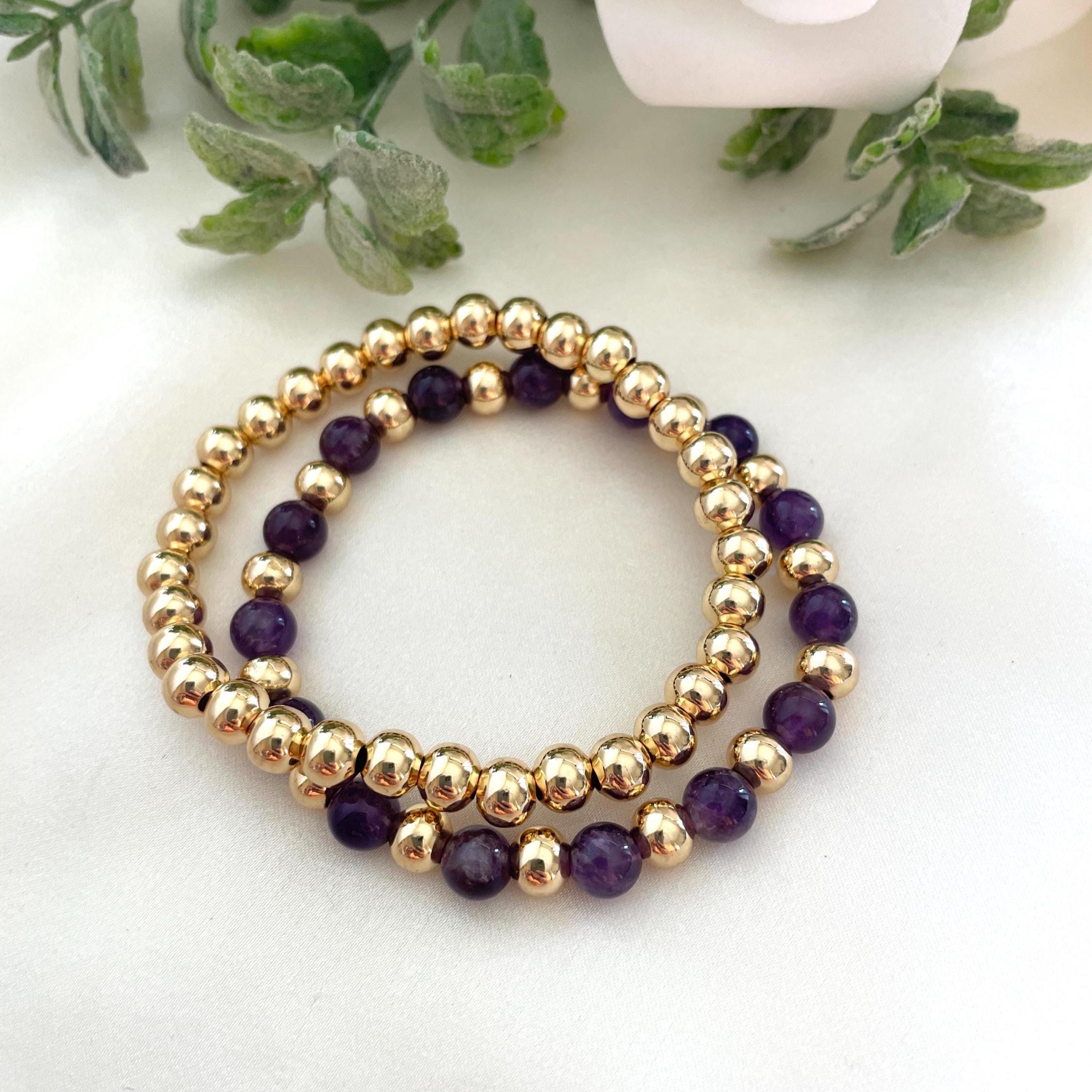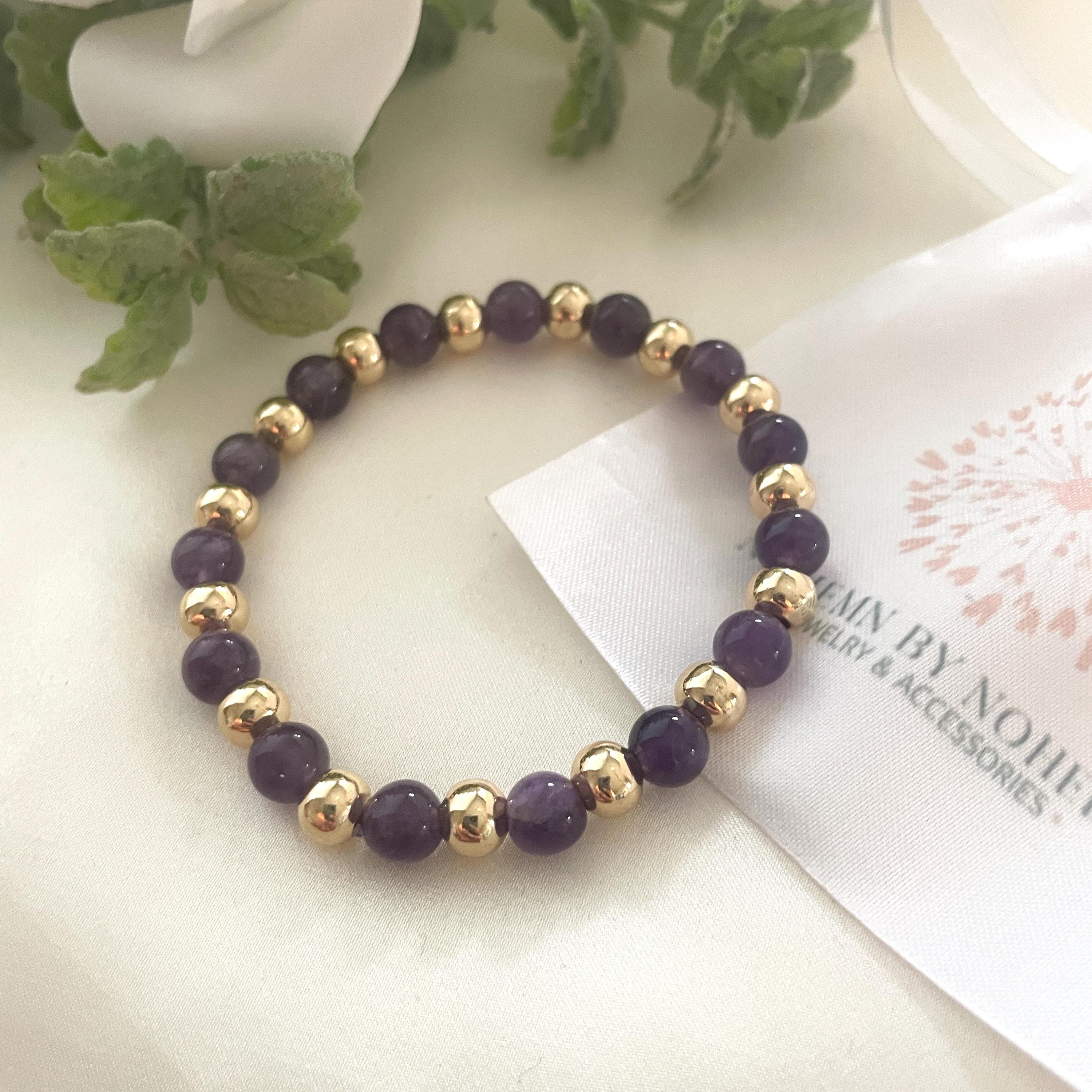 Amethyst Beaded Bracelet, Gold Accent, Handmade Stretchy Jewelry