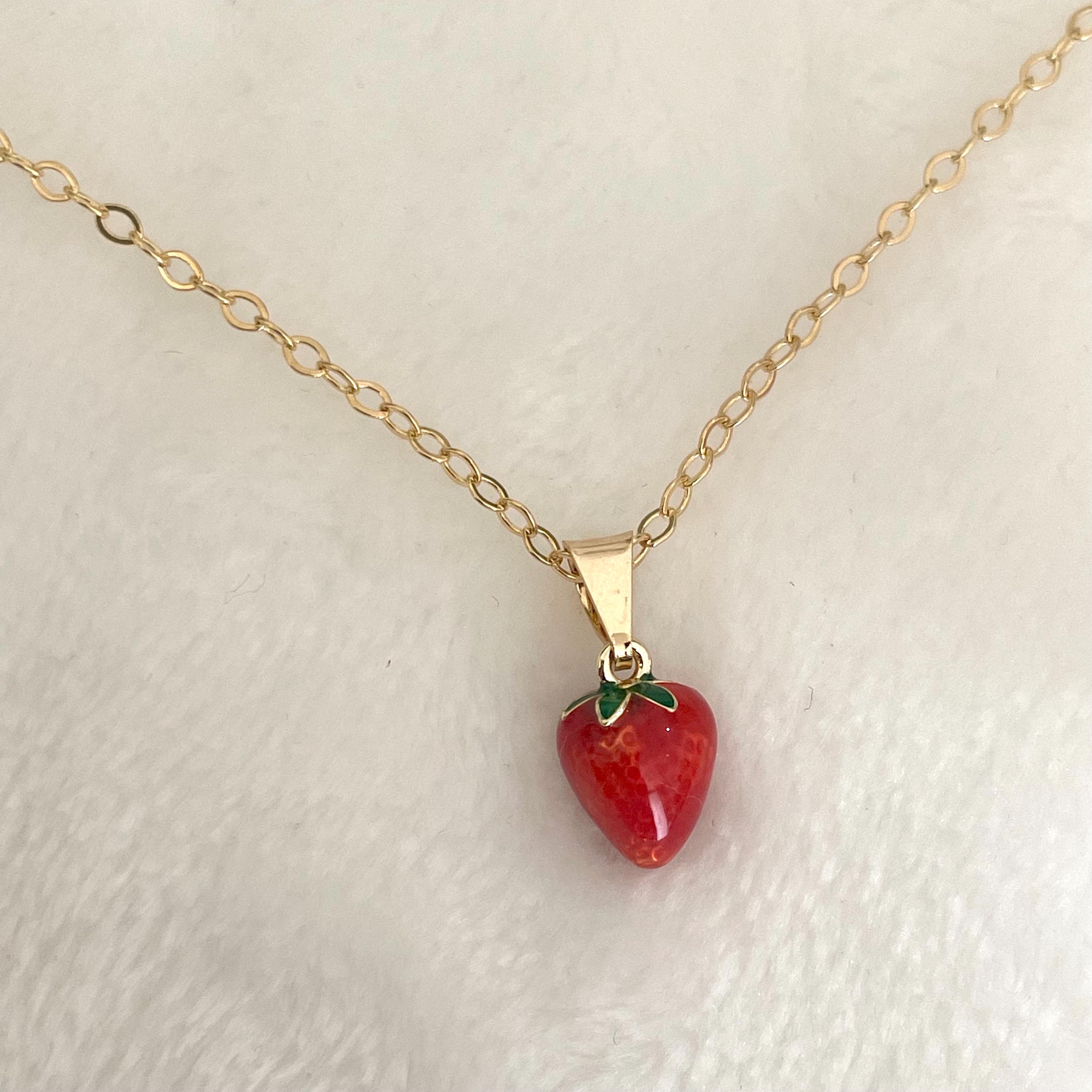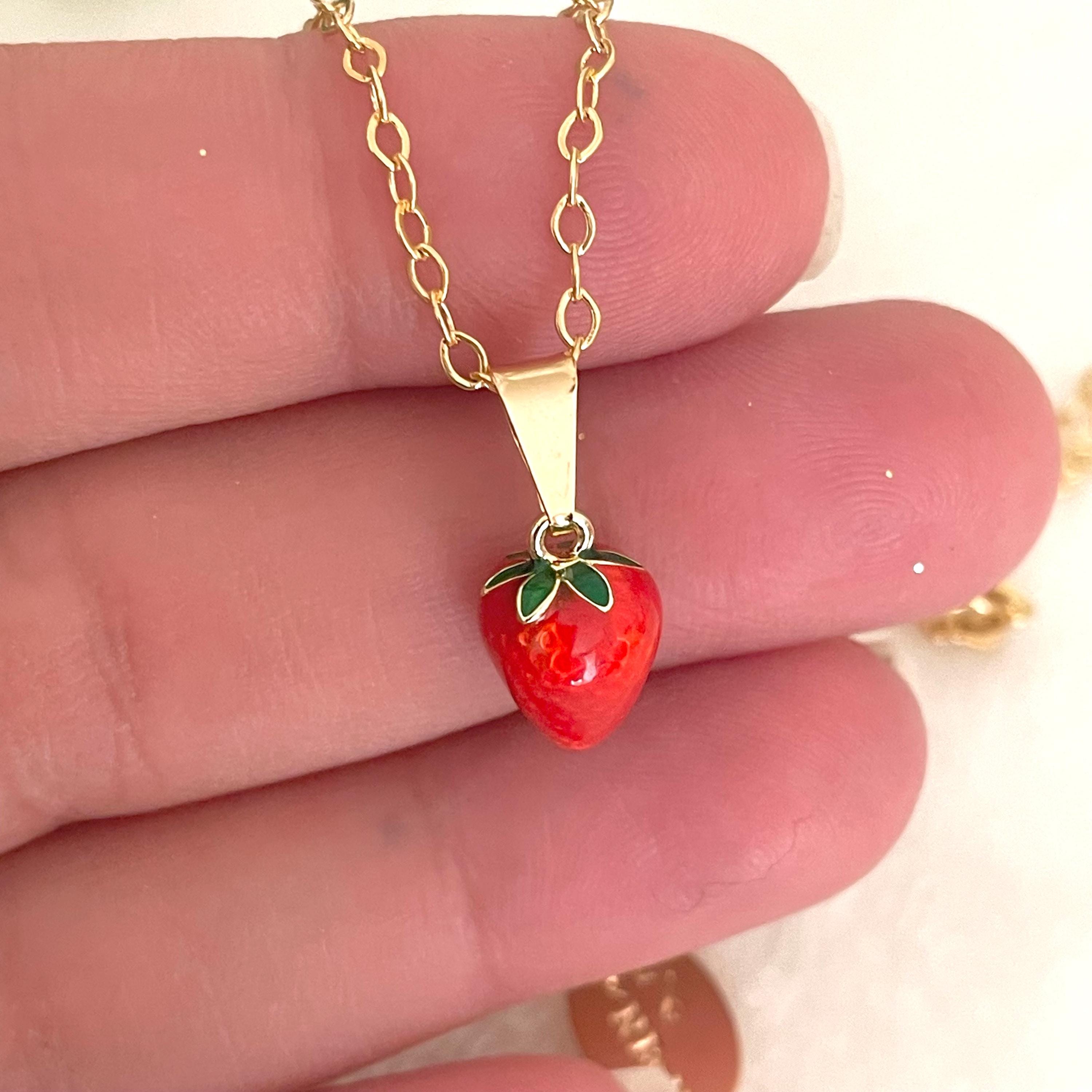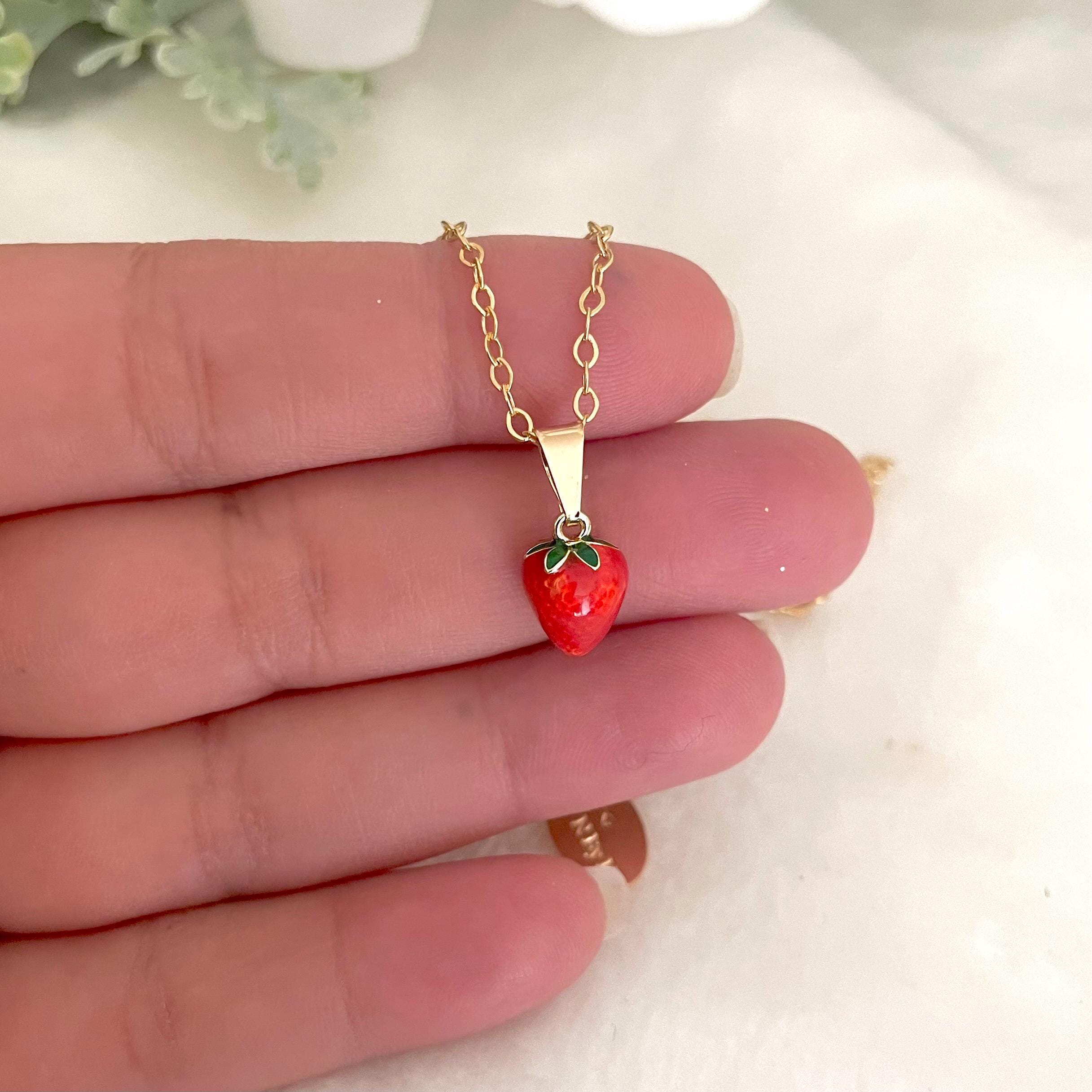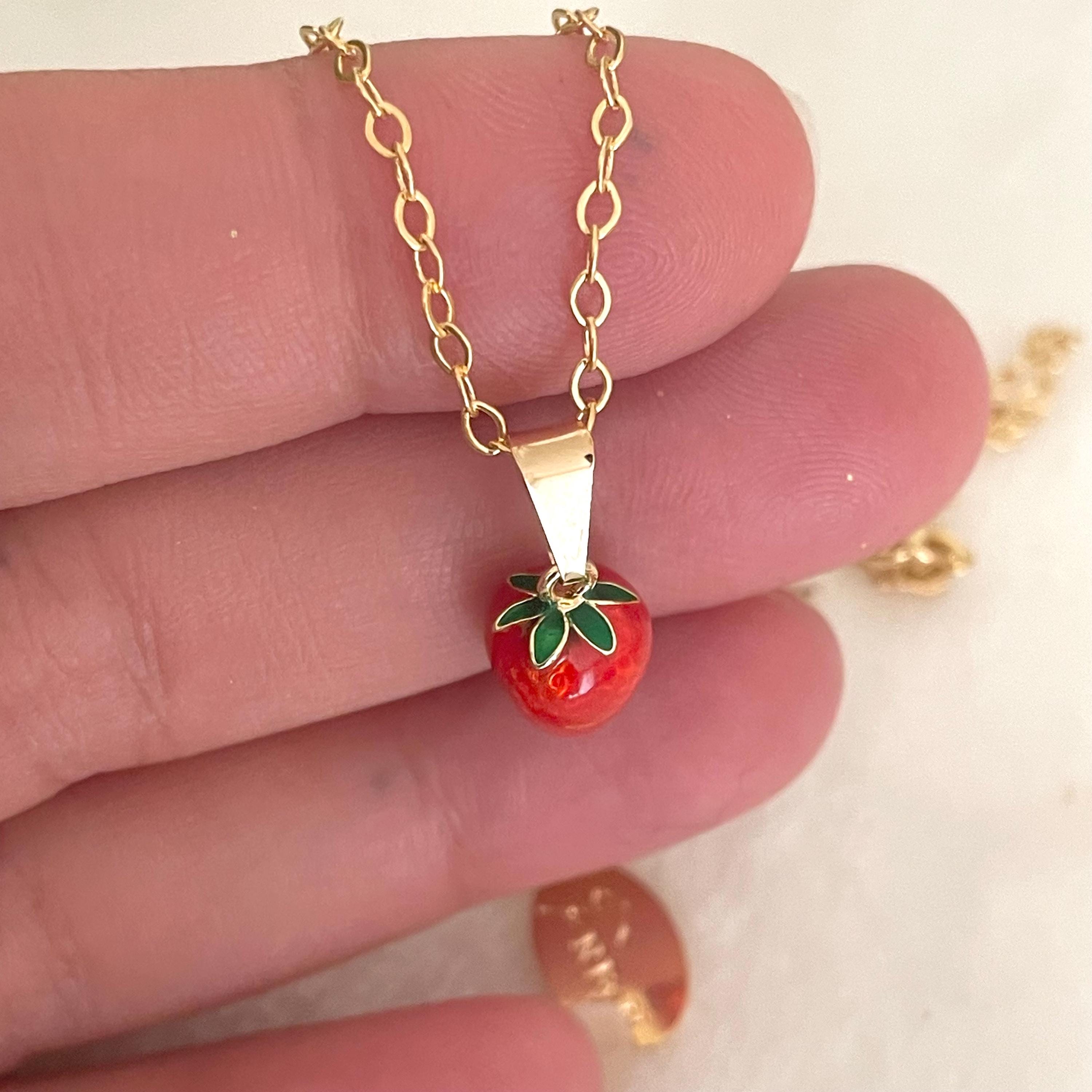 Strawberry Necklace: 18K Gold Plated, Enamel Charm, Tiny strawberry, Mini Strawberry Necklace